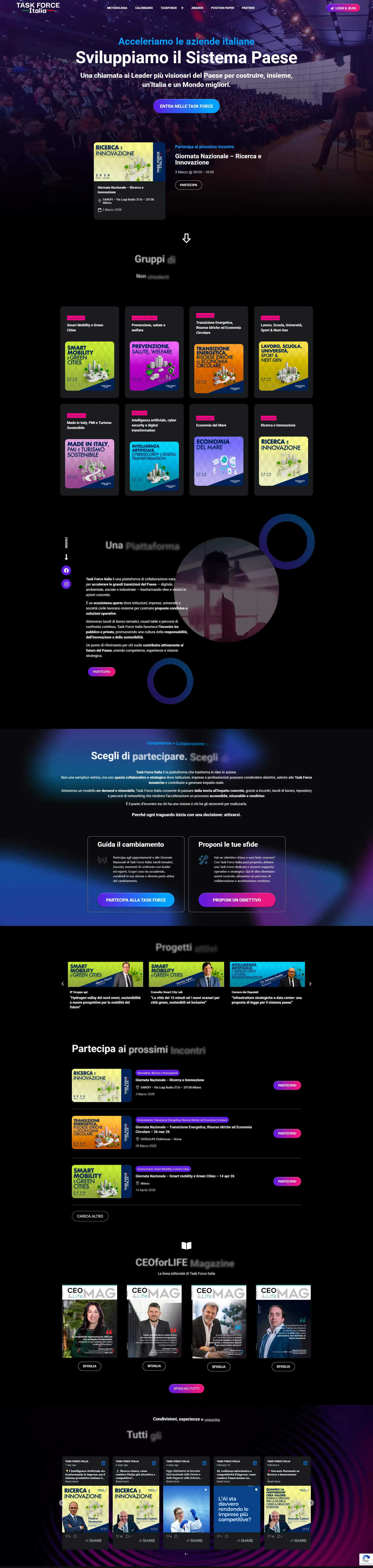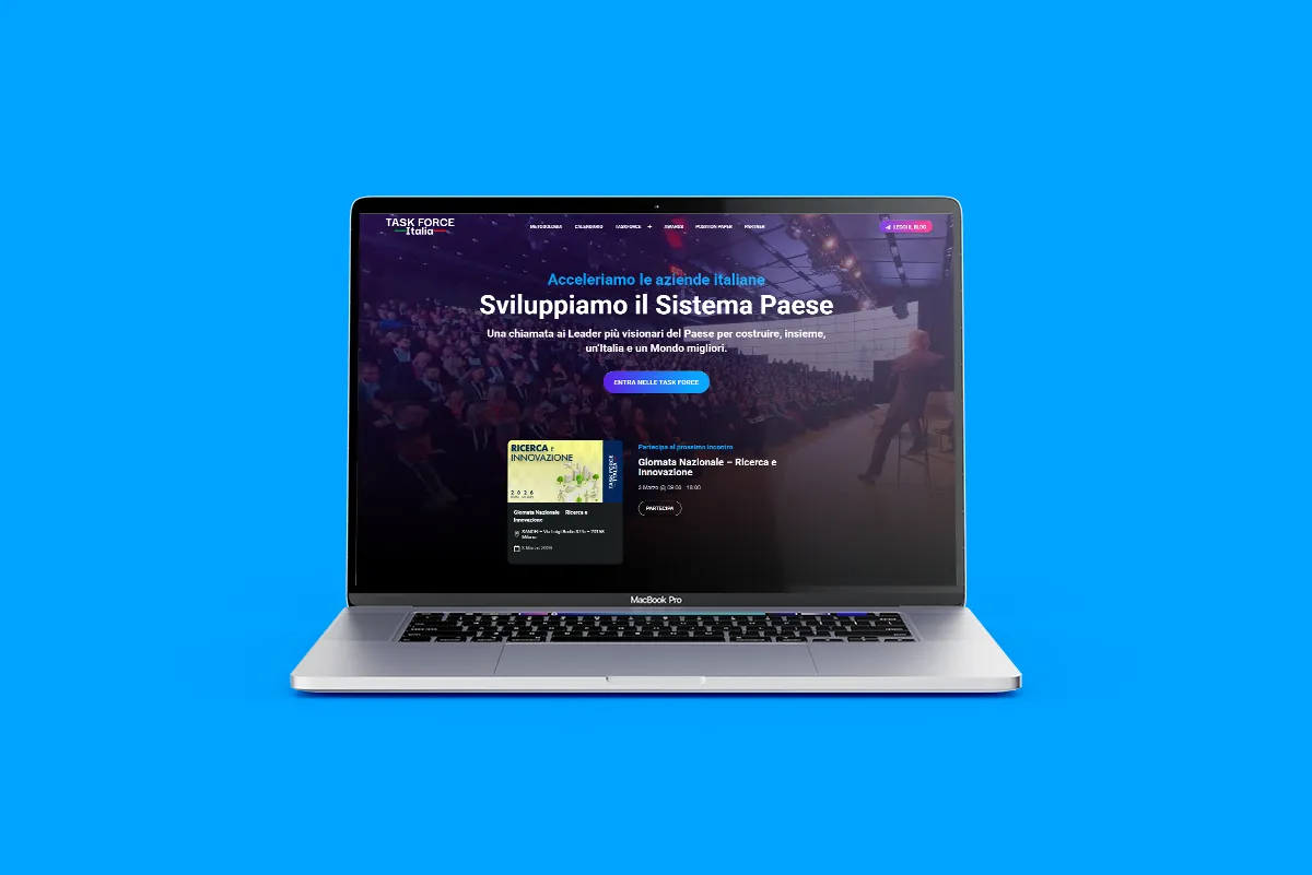 For Task Force Italia, I created a web platform dedicated to meetings and event management, developed in WordPress with Elementor and integration of The Events Calendar for planning and scheduling. The project involved the creation of a custom post type called “Taskforce” to organize event archives and related informational content, as well as an additional post type dedicated to media archives (videos and photos) that can be filtered by individual event. I implemented a proprietary live system that allows simultaneous activation of live videos on multiple pages of the site, ensuring maximum flexibility during events. Through the use of custom ACF fields and dynamic content, I structured a modular system that allows the client to independently update all event-related information, maintaining graphic and functional consistency across the platform.